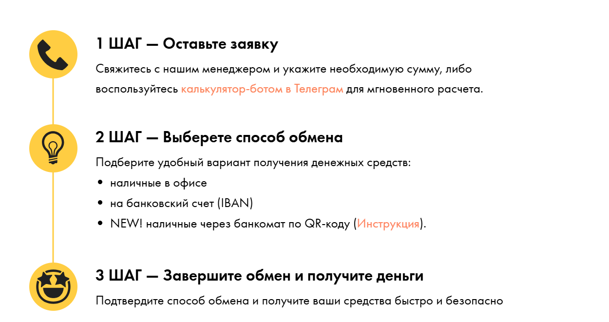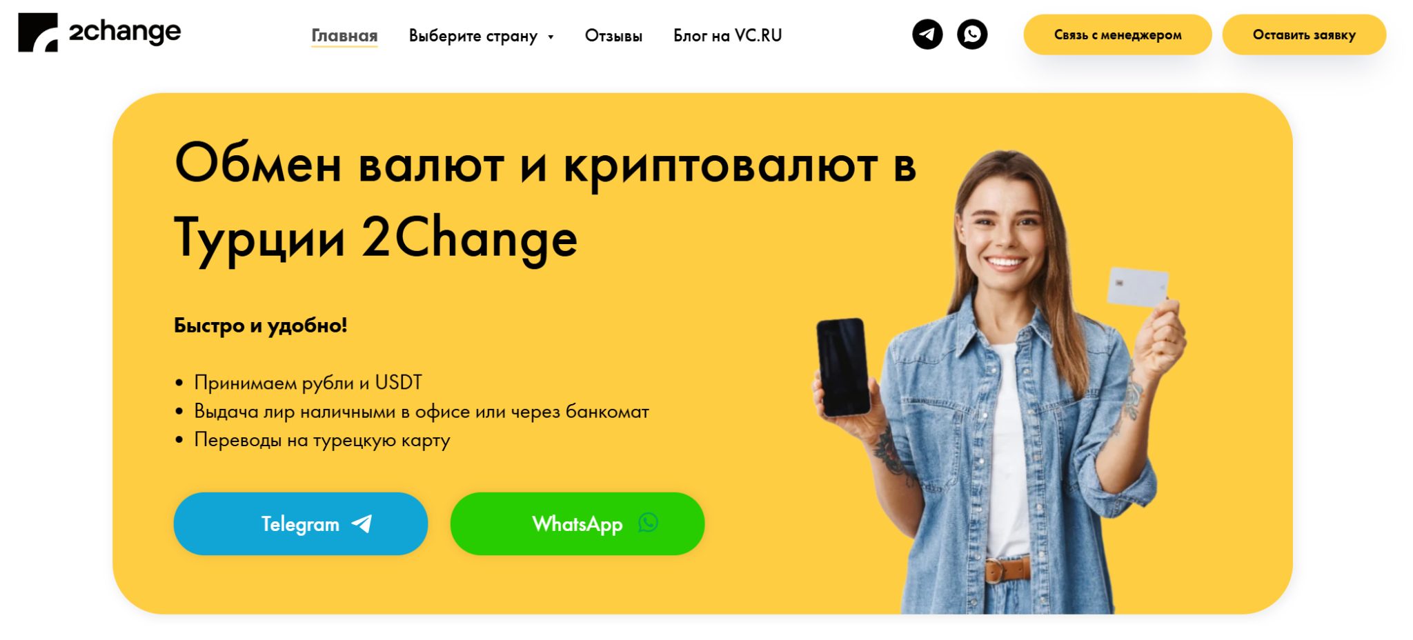 2Change обменивает российские рубли и USDT на турецкие лиры. Клиенты могут оставить заявку через Telegram или WhatsApp, где нужно указать сумму и желаемый способ получения средств. После согласования с менеджером происходит перевод рублей с российского банка, а взамен выдаются лиры. Получение средств возможно тремя способами: