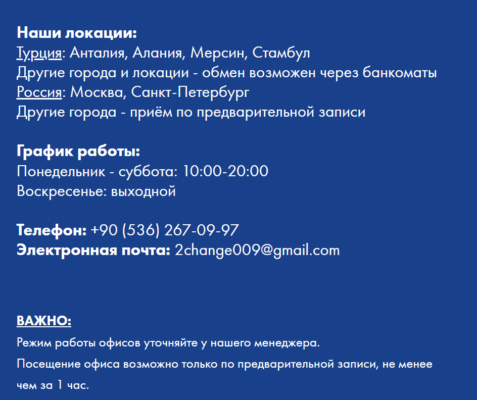 2Change осуществляет финансовые операции для русскоязычных клиентов в Турции и некоторых других странах. Он функционирует с начала 2020-х годов. Работает через сайт 2change pro, а также через тг-бот. Главным лицом выступает менеджер Александра, которая упоминается во всех отзывах и контактах.
