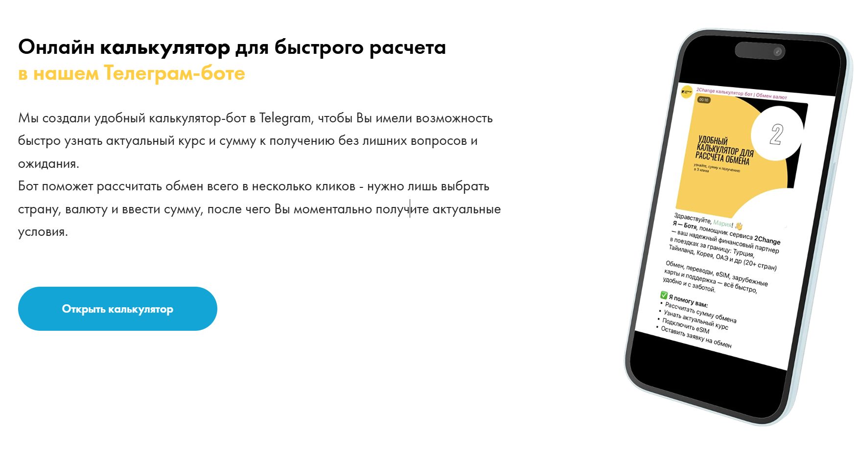 К каждому обмену через QR-код компания добавляет в подарок электронную SIM-карту eSIM с одним гигабайтом интернета. Организация также организует переводы на турецкие карты и помогает с оформлением зарубежных карт Visa. Для удобства в тг-боте работает онлайн-калькулятор. В нем можно рассчитать сумму к получению по актуальному курсу.