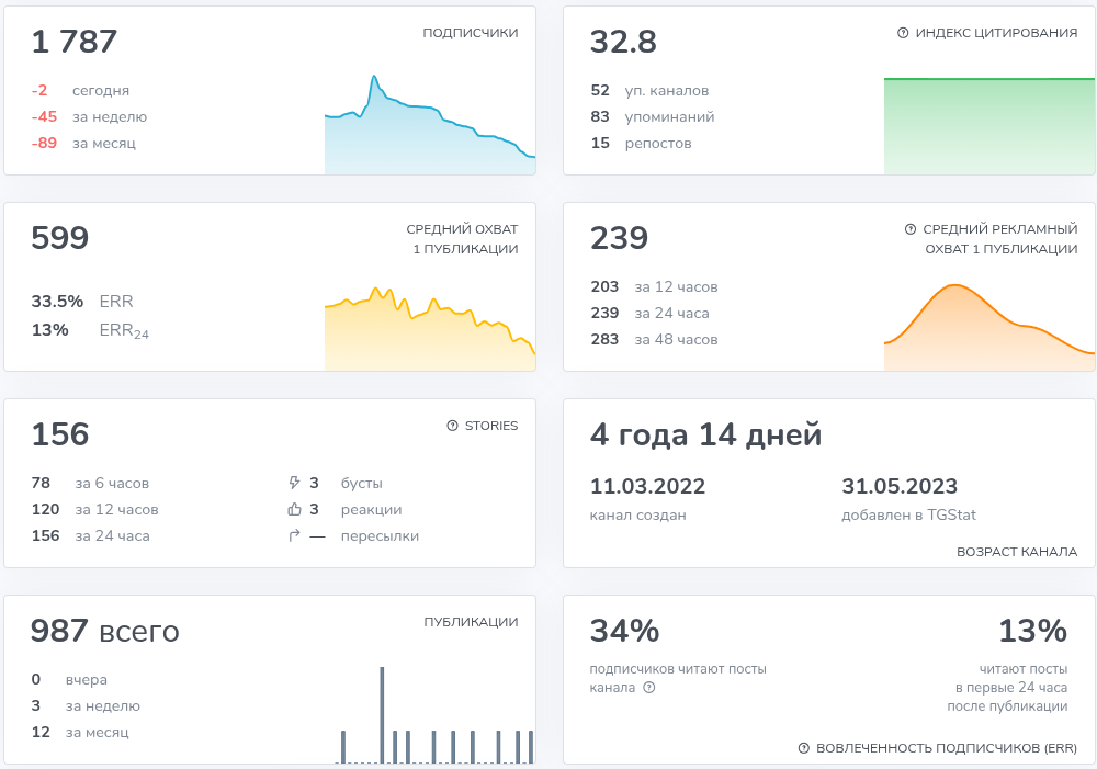 • Показатель общей вовлеченности (ERR) достигает 35,3%, а свежие публикации читают порядка 34% от общего числа фолловеров. В целом, аудитория живая и довольно активная.