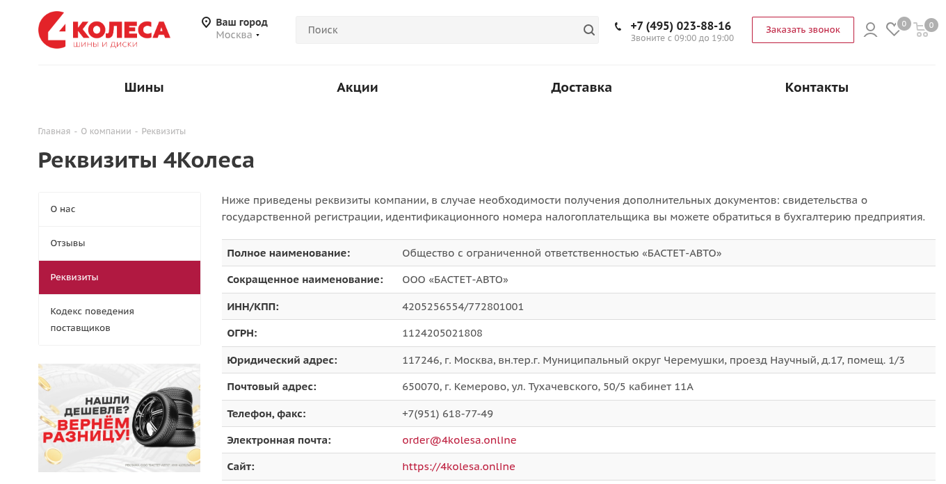 Юридическая база проекта «4 Колеса» — ООО «БАСТЕТ-АВТО» с официальной регистрацией с 2012 года. Внушительный возраст компании отчасти снимает подозрения в банальном скаме. Владельцы бизнеса развернули вполне реальную инфраструктуру: помимо виртуального каталога, у них есть сеть оффлайн-магазинов сразу в девяти городах РФ. Наличие фактических точек с товаром укрепляет репутацию гораздо лучше любых рекламных постов.