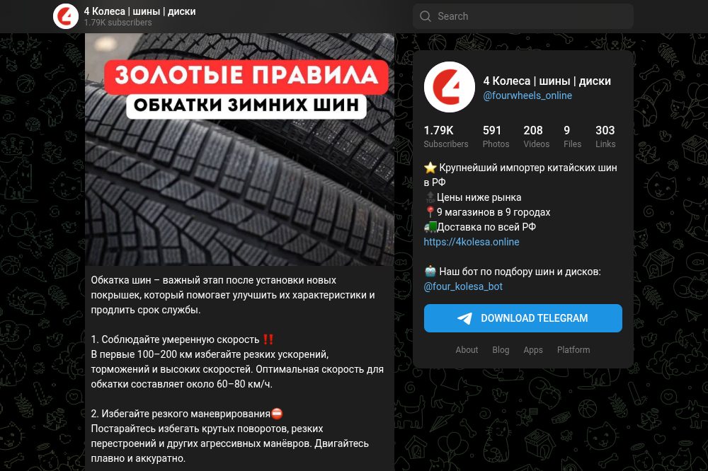 Телеграмм-канал «4 Колеса | шины | диски»: анализ контента и статистика паблика