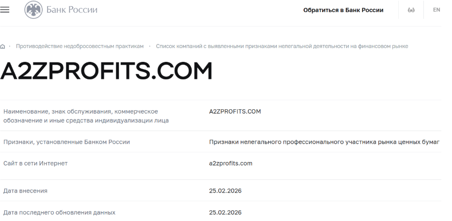 На официальном сайте не указывается адрес офиса проекта и неизвестно, кем должен регулироваться A2zProfits com. Платформа числится в реестре центрального банка России как проект с признаками нелегального участника финансового рынка. В черный список платформа была внесена в начале 2026 года, почти сразу же после того, как она была зарегистрирована.
