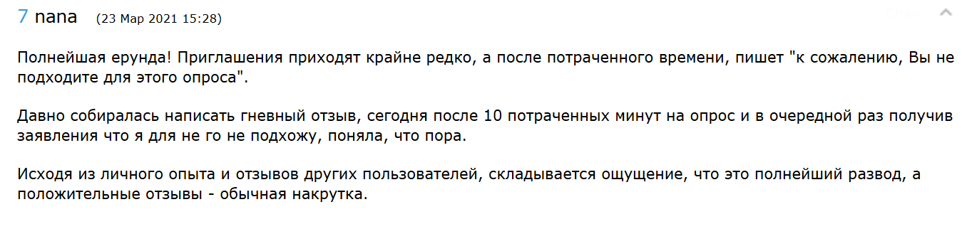 В течение последних лет сайт продолжает работать, но приглашения приходят редко. Большая часть пользователей не подходит по критериям для прохождения опроса. Зачастую такое сообщение приходит после заполнения первой части анкеты. На этом фоне у многих складывается впечатление, что платформа является разводом.
