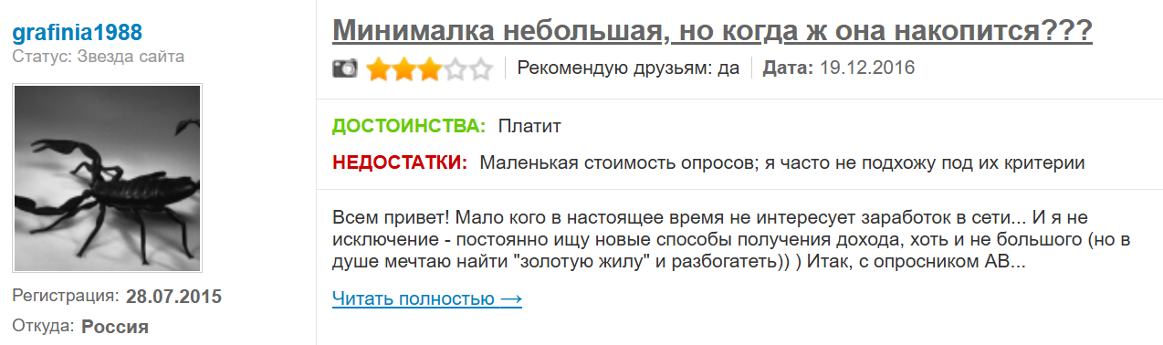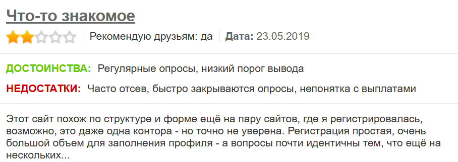 Рассматриваемый сайт работает до сегодняшнего дня и предлагает регистрацию для заработка на опросах. Он подходит для людей, у которых есть свободное время и желание зарабатывать на опросах. При этом рассчитывать на стабильный и большой заработок не приходится из-за жестких и непонятных критериев, а также крайне небольшого вознаграждения.