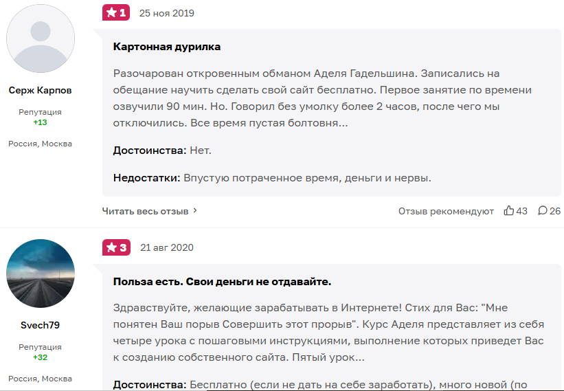 Адель Гальдешин получил противоречивые отзывы о своем тренинге, которые не позволяют составить единого мнения о его проекте. Однако наша команда заметила множество жалоб на курс ментора за различные годы существования ресурса. Негативные комментарии однозначно превалируют.