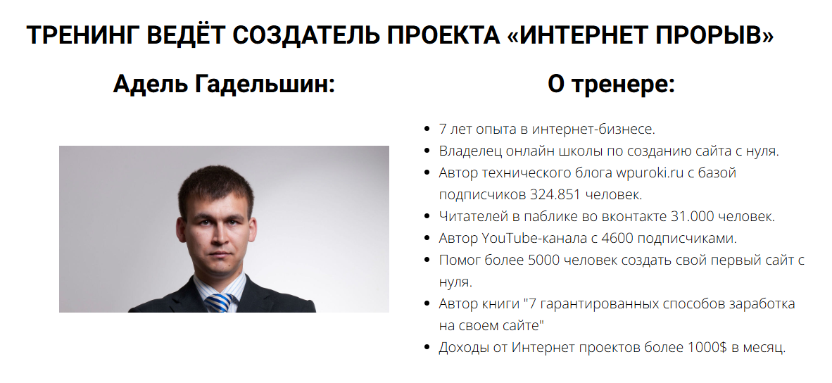 Адель Гадельшин – российский интернет-предприниматель и основатель онлайн-площадки Тренинговый центр Интернет прорыв, Internet-proryv com. На ресурсе опубликованы обучающие материалы по созданию сайтов и заработку на своих платформах. Читайте обзор до конца, чтобы понять, насколько полезными в действительности является курс Аделя.