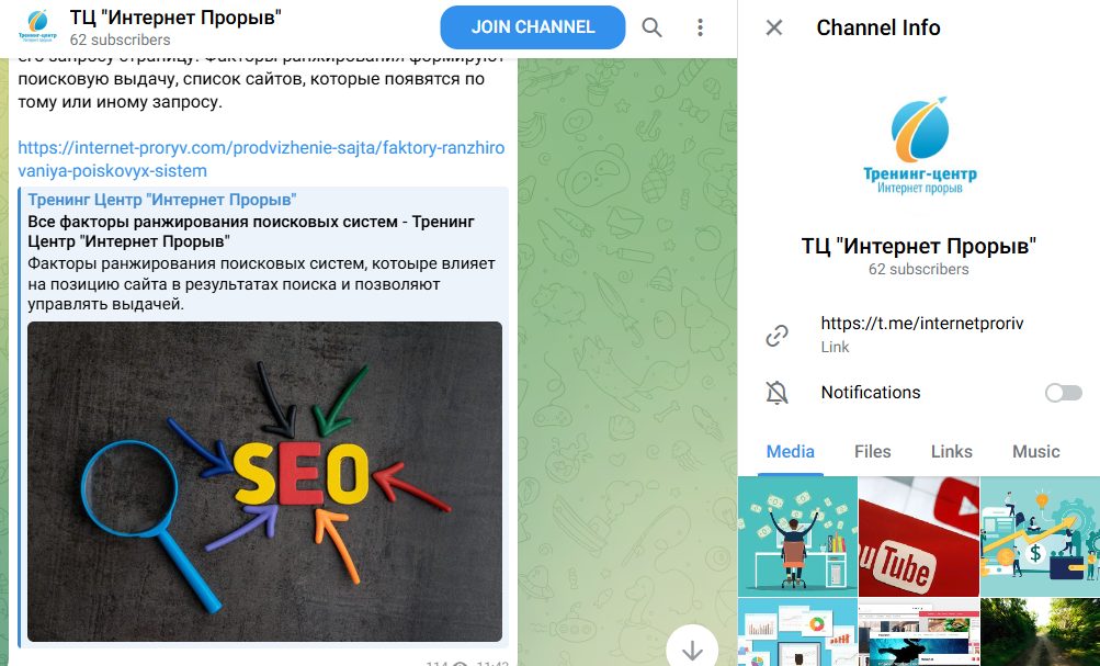 Заметим, что публикации в Телеграмм-канале ТЦ Интернет Прорыв, @ internetproriv прекратились в 2022 году. На момент написания оставшаяся аудитория составляет 62 подписчика. Просмотры были в пределах сотни, комментарии отключены.