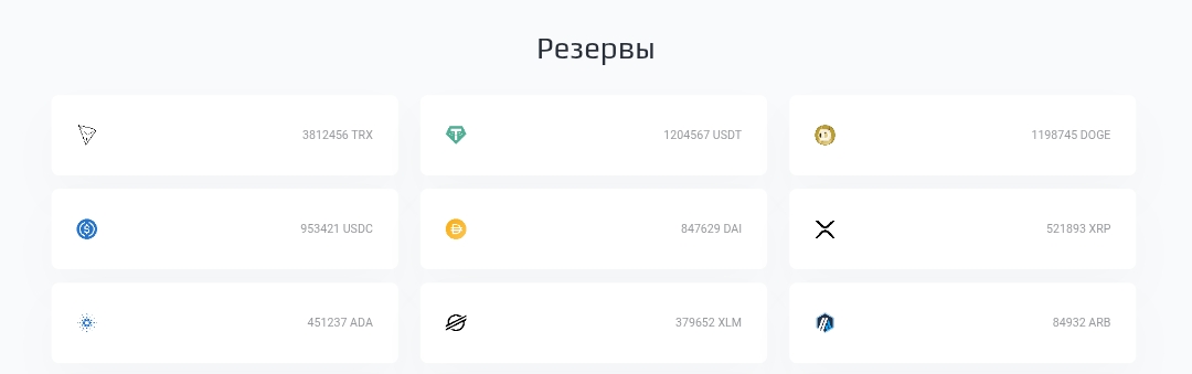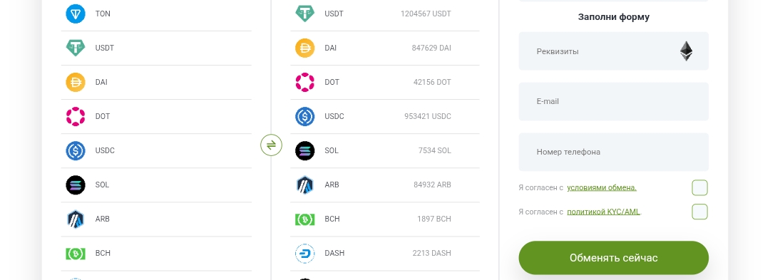 Площадка работает как п2п-обменник, поддерживающий BTC, ETH, USDT, TRX, SOL, TON, DOGE и еще около 20 десятков активов. Внешне интерфейс прост: на главной отображаются пары, текущие резервы и минимальные суммы. Регистрации не требуется, достаточно разового заполнения формы с адресом кошелька, почтой и телефоном.