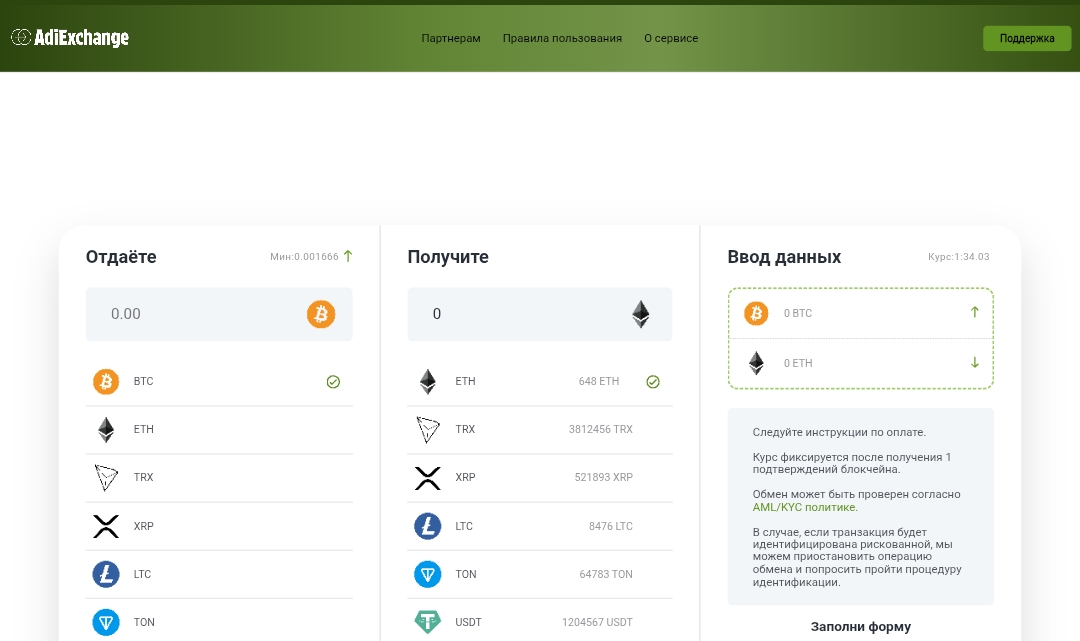 Для обмена пользователь выбирает монету, которую отдает, затем указывает криптовалюту получения. После ввода кошелька, e-mail и телефона, на экране появляется адрес для внесения денег. Курс фиксируется после подтверждения блокчейна. Минимальный порог для BTC на Adi Exchange com установлен около 0.001666 BTC, для остальных монет лимиты чуть выше среднего по рынку.