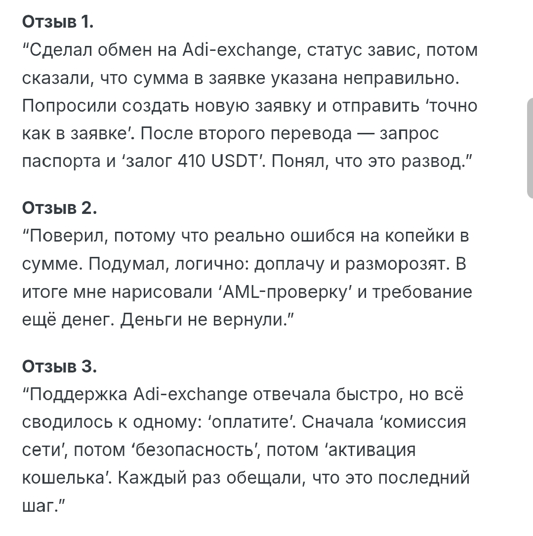 Есть и сомнительные моменты. Процесс иногда переводится в ручной режим, из-за чего деньги зависают до 24 часов, что подтверждают жалобы в тематических сообществах. Отсутствие лицензии и юридического адреса ограничивает правовые способы защиты. Еще один нюанс связан с AML: Adi Exchange com оставляет за собой право запросить документы, если транзакция сочтена подозрительной, поэтому анонимность фактически ограничена.