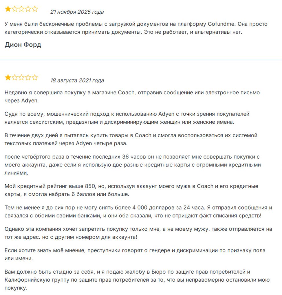 Но более свежие отзывы о платежной системе Adyen отрицательные. Русскоязычная аудитория никак не комментирует сервис, отзываются снова иностранное комьюнити. Платформа может быть немного дороже своих конкурентов. Возврат средств проходит через офисы в Голландии, адресы которых не подтверждены. Это может увеличить время ожидания получения денег, что во многих случаях раздражает клиентов. Инвесторы считают, что дизайн сайта можно было бы улучшить. Он мало настраиваемый и несколько устаревший. У многих пользователей платежная система не принимает документы. А одна девушка столкнулась с проблемой неравенства. Все операции со счета ее мужа проходили идеально, а ее операции блокировали. Девушка посчитала, что это только из-за ее пола и обратилась в службу по защите прав потребителей.