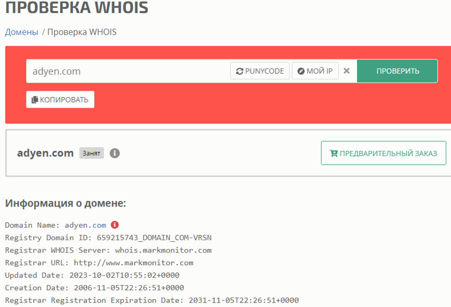 Домен платежной системы Adyen создан в 2006 году, но управление на самом деле взяли в октябре 2023 года. С начала его реальной деятельности прошло 3 года. Владельцы обманывают клиентов, говоря о многолетнем стаже. Но работа домена продлена до 2031 года. Возможно, в будущем разработчики действительно будут развиваться. У платформы есть шансы на доверительное отношение к ней.