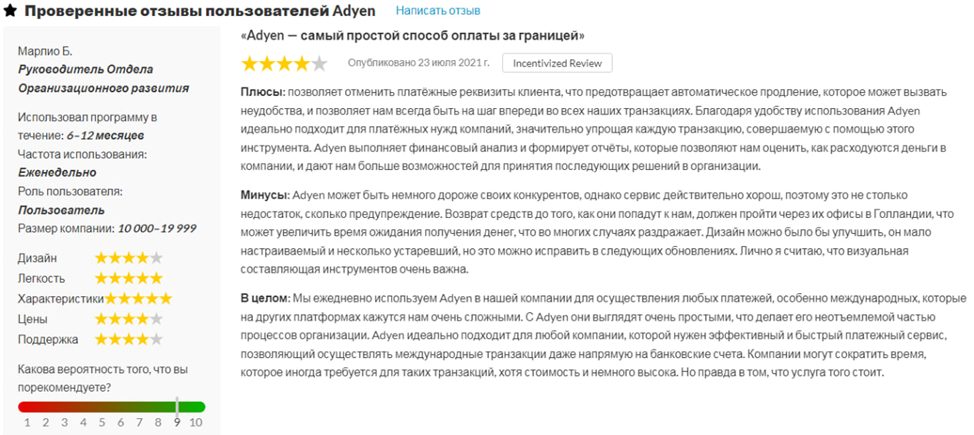 Пользователи ежедневно используют Adyen в своих компаниях для осуществления любых платежей. Больше всего спрос имеется на международные операции, которые на других платформах кажутся очень сложными. На Adyen они выглядят очень простыми, что делает эту систему неотъемлемой частью процессов организации. Платформа идеально подходит для любой компании, которой нужен эффективный и быстрый платежный сервис. Он позволяет осуществлять международные транзакции даже напрямую на банковские счета. Компании могут сократить время, которое иногда требуется для таких транзакций. Но стоимость немного высока.