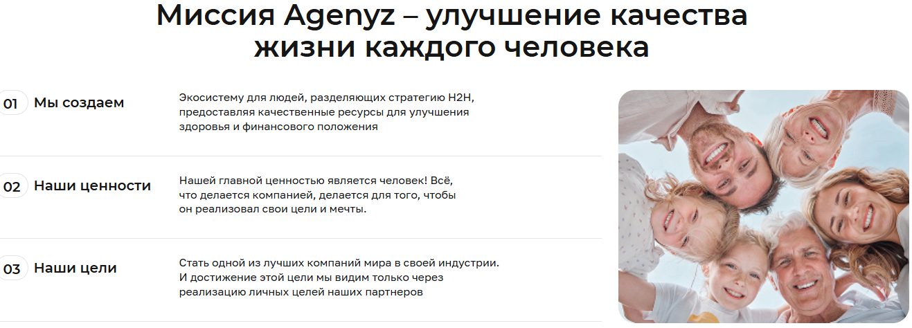 Компания Agenyz (также известна как АльфаДженис) появилась в 2018 году. Ее создателей зовут Алла и Олег Андрейчуки, она зарегистрирована в Москве, также у нее есть офис в Ларнаке, Кипр. Она занимается продажей БАДов, косметики и здорового питания, а главными ценностями ее владельцы называют здоровье и красоту. Она устроена по принципу сетевого маркетинга и прямых продаж с доставкой по всему миру.