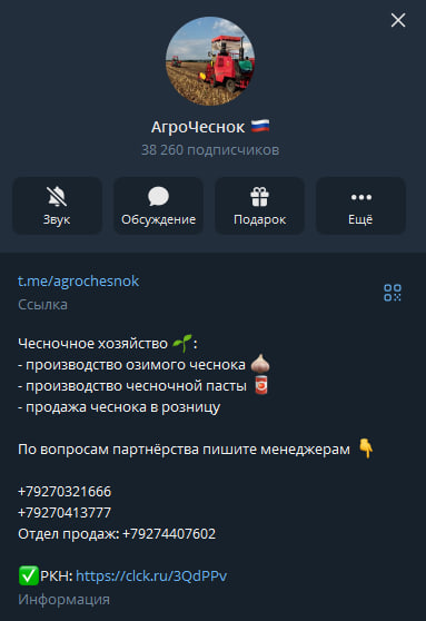 Телеграм-канал Agrochesnok зарегистрирован 3 года и 11 месяцев назад. За это время аудитория выросла до 38,2 тысяч подписчиков. Их вовлеченность составляет 2,31%. Около 5 тысяч просматривают публикации. Реакций набирается максимум до 70 штук. Комментировать посты можно, но пользователи этого не делают. Также заметны резкие подписки и перепады в аудитории. Это может свидетельствовать о накрутке подписчиков. Канал часто рекламируют в других блогах. Возможно, его указывают для использования ботов. То есть, нужно быть обязательно подписанным на него, чтобы какой-то бот или приложение стало работать. Так набирается аудитория. Кроме новостей и коротких роликов администраторы ничего не публикуют.