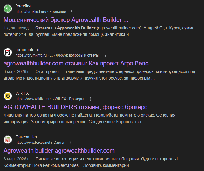 Если вы еще не определили, будете ли пользоваться услугами Agrowealth Builders и насколько это рискованно, рекомендуем ознакомиться с наглядным списком обнаруженных фактов ниже.
