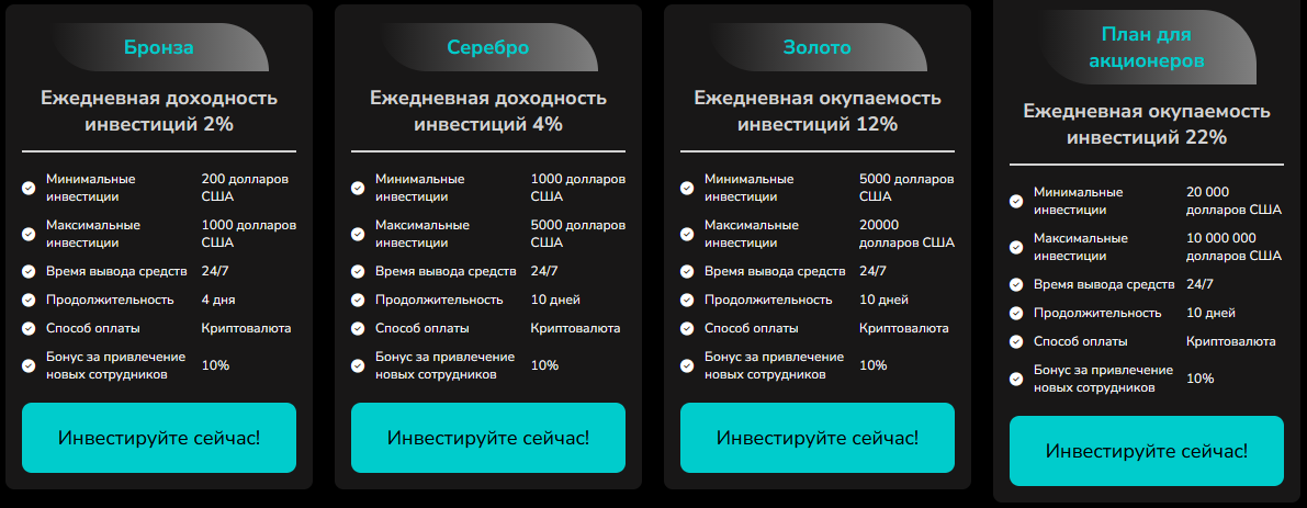 Однако на деле предлагают фиксированные тарифы с конкретной процентной ставкой. На главной странице просят якобы инвестировать в бронзу, серебро и золото с доходностью от 2% до 12% в день.