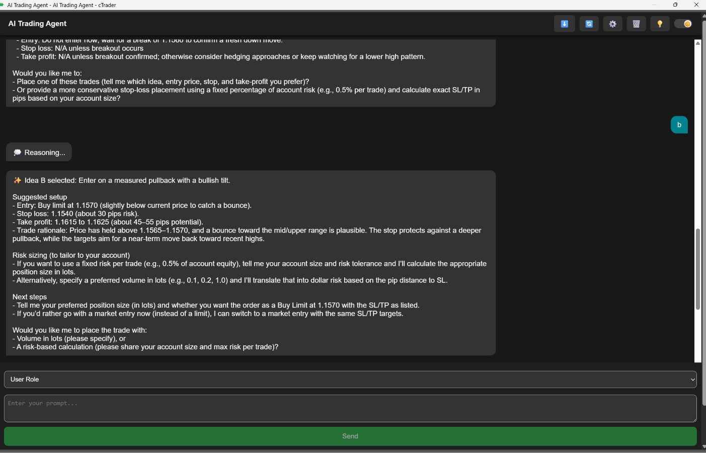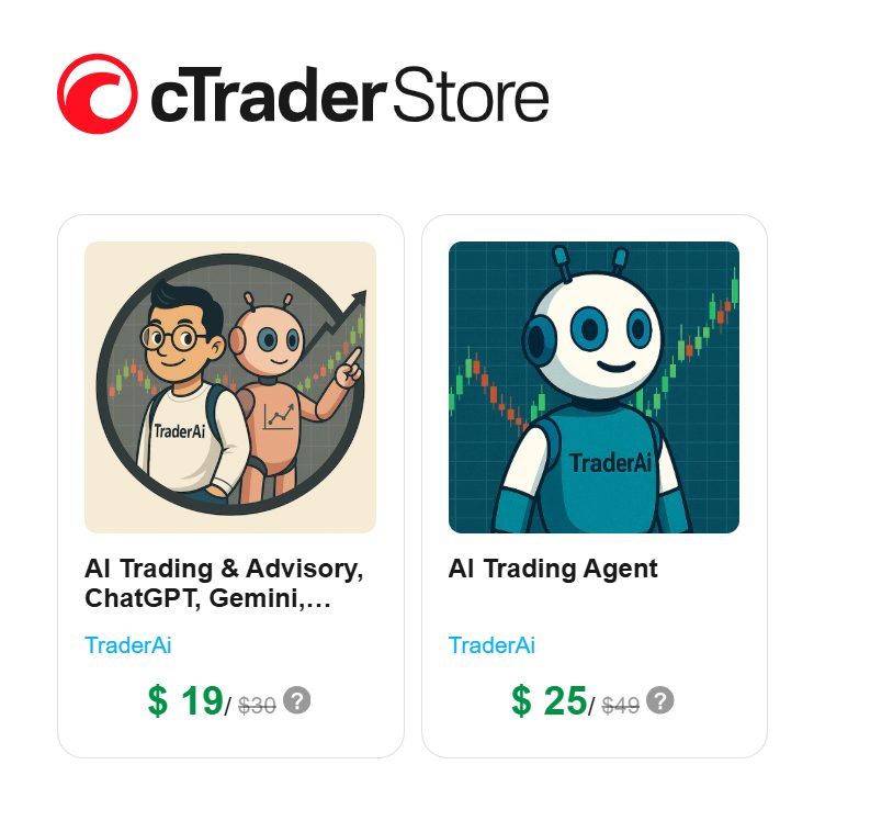Плагин AI Trading Agent интегрируется через платформу cTrader. Вспомогательный инструмент основан на больших языковых моделях. В магазине указан профиль TraderAi.