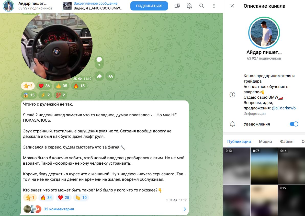 На сторонних независимых платформах про него почти ничего нет. Лишь короткая заметка на Vklader, в которой написано, что Айдар Мухаметшин мошенник. Но и ей верить тоже нельзя. Ведь там не расписано, почему Айдар Мухаметшин — обман. Но да — схема «розыгрыша BMW с условием вступить по рефералке на Pocket Option» выглядит странной. Возможно парень просто решил хайпануть.
