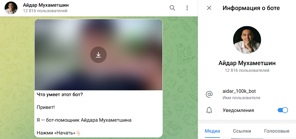 Работает по ссылке @aidar_100k_bot. В месяц его запускает примерно 12-13 тысяч пользователей.