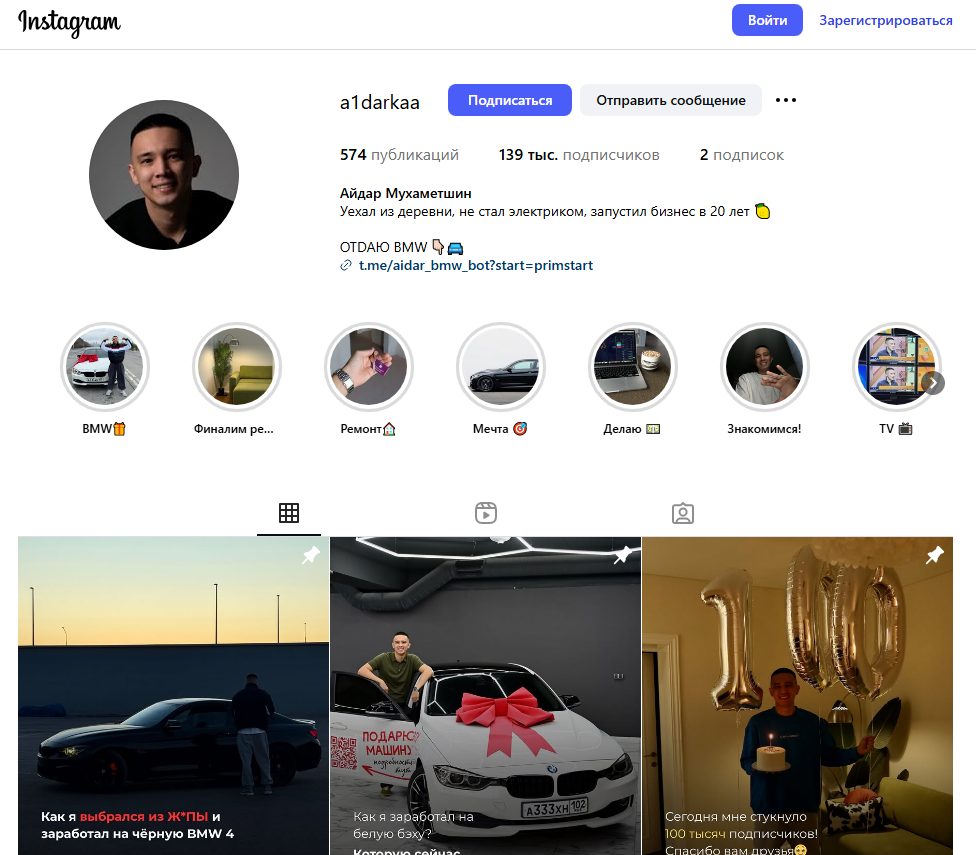 Имеет почти 140 тысяч подписчиков. Публикаций 570+. В описании странички — красивая, но вымышленная мини-история — «Уехал из деревни, не стал электриком, запустил бизнес в 20 лет 🍋».