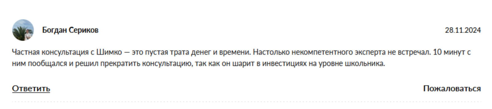 Но есть и негативные комментарии. Один из комментаторов покупал индивидуальную консультацию у Игоря и остался ею недоволен. Он считает, что уровень знаний инвестора недостаточный, чтобы пользоваться его услугами.