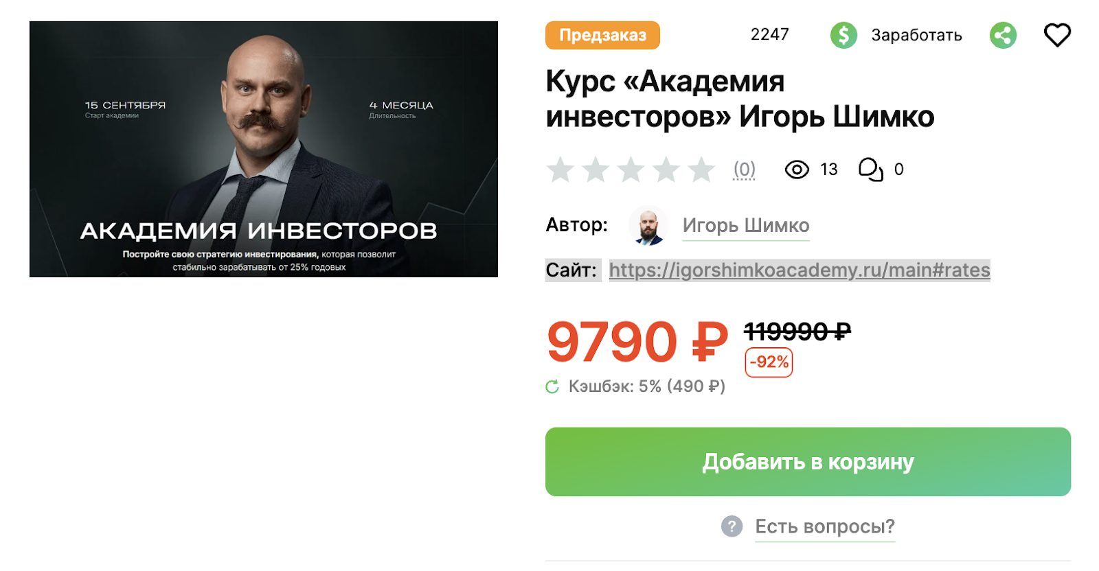Образовательную программу «Академия инвесторов» Игоря Шимко в тарифе «Менторское сопровождение» в марте 2026 года продают за 9790 руб. При этом совсем недавно она стоила 119 тыс., то есть на порядок больше. Такой дисконт может быть связан с тем, что спроса на этот инфопродукт нет и автор пытается продать никому не нужный «воздух» новичкам за любые деньги.