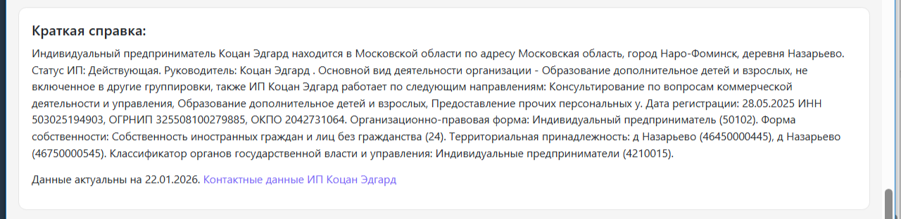 Образовательная лицензия выдана именно ИП Коцану Эдгарду, а не Ирине весной 2025 года. Самое примечательное, что оба наставника рассказывают, что живут за границей, постоянно путешествуют. Однако обе лицензии выданы в одной и той же деревни и в одном и том же здании.