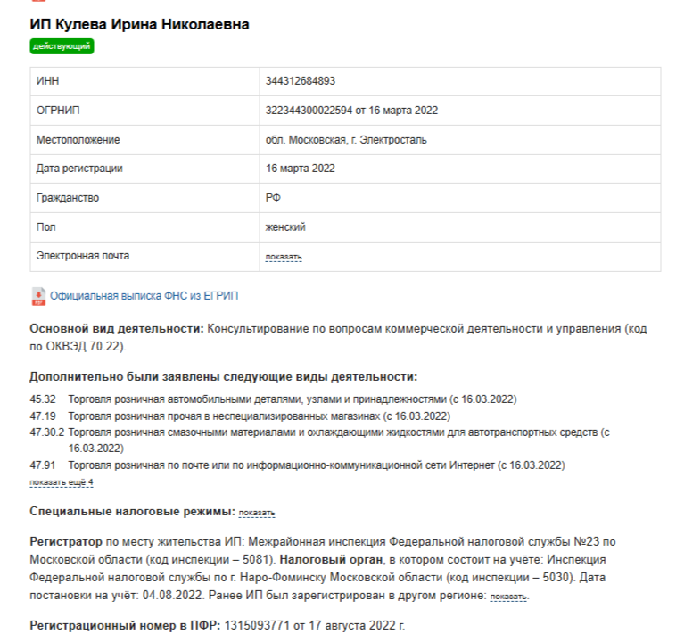 Мы проверили деятельность телеграм-бизнесменов и выяснили интересные факты. Ирина Кулева зарегистрирована в качестве ИП в 2022 году. В течение долгого времени основным видом деятельности являлась продажа автомобильных деталей и сопутствующих товаров. Только недавно девушка добавила новую услугу – консультирование по финансовым вопросам.
