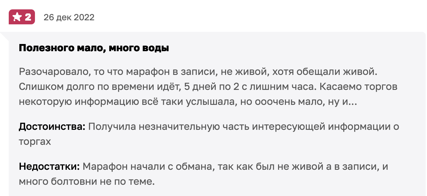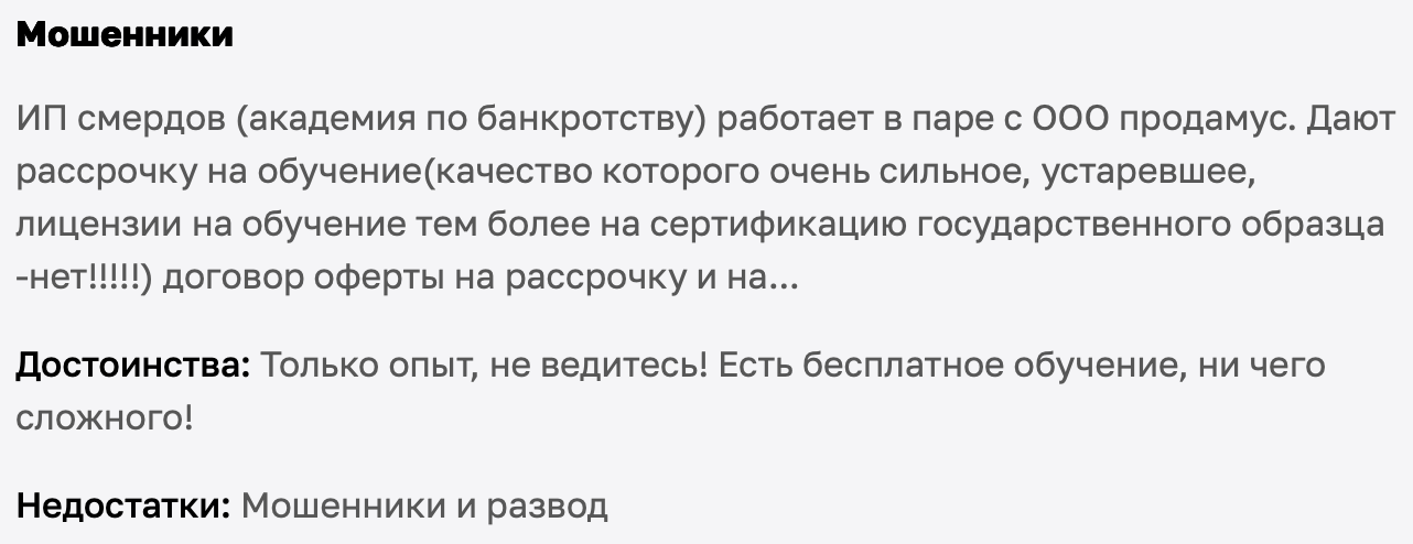 На отзовиках люди жалуются, что ликвидные лоты почти никогда не доходят до торгов — их забирают раньше, а те, что остаются, либо требуют огромных вложений, либо в плохом состоянии. Один отзыв прямо называет проект «Академия Торгов» промыванием мозгов.