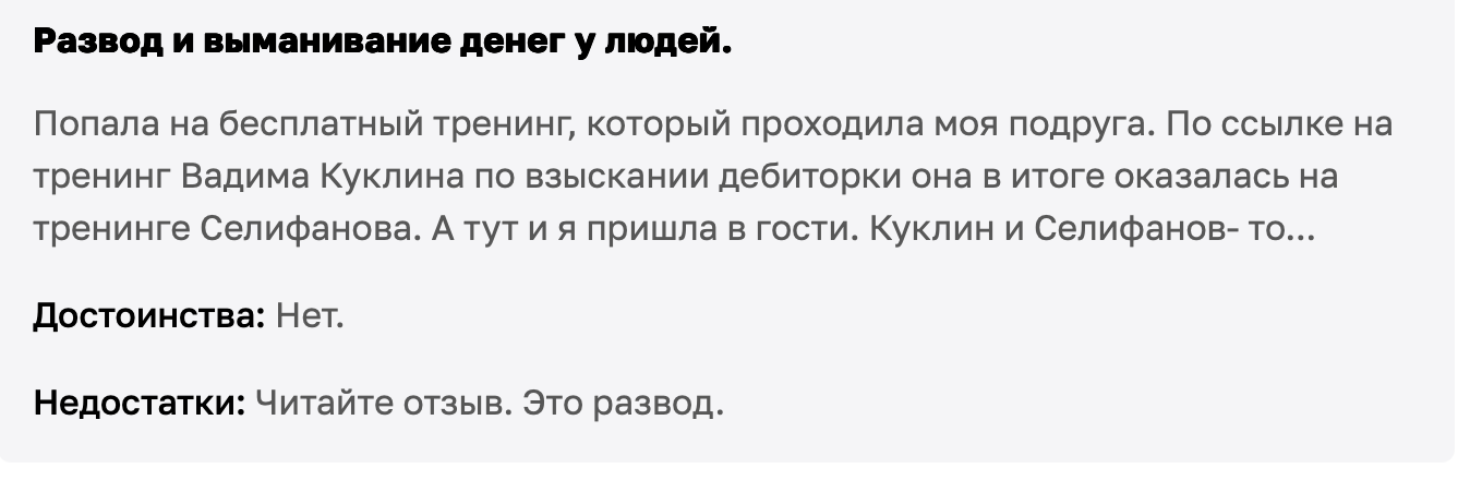 Негатива в адрес инфопродуктов от Селифанова много. В основном люди говорят, что его контент однотипный и своих денег курсы не стоят. Многие пишут, что во время обучения получили только общие фразы и тонну «мотивационных» речей.