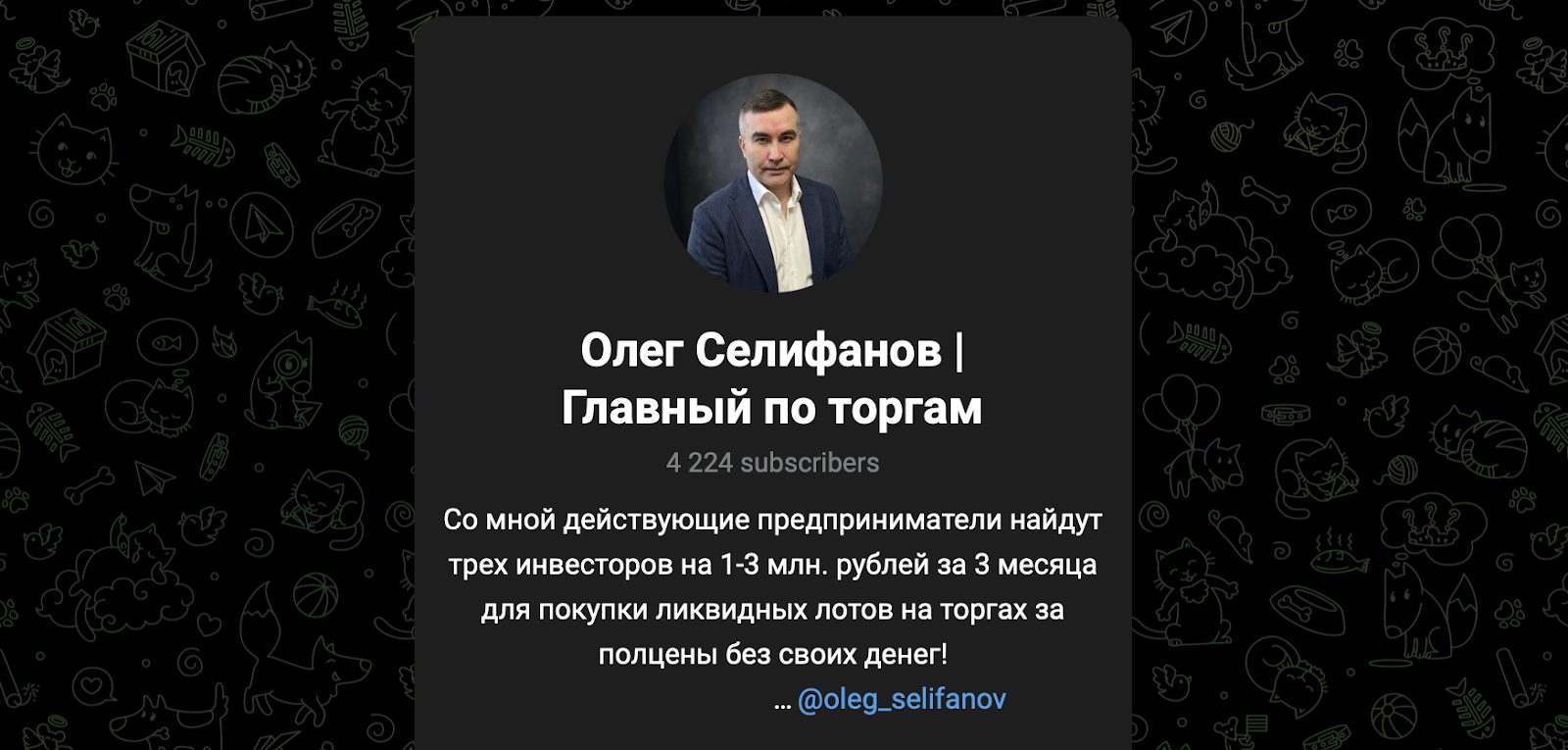 Главный «двигатель» Селифанова в интернете — его телеграм канал Olegselifanov1. В нем Олег делится советами по торгам, анонсами курсов и мотивационными постами — подписчиков там около 4 тысяч, но активности мало: посты выходят раз в пару дней. По любым вопросам сотрудничества админ предлагает писать ему на личный телеграм-аккаунт olegselifanov.