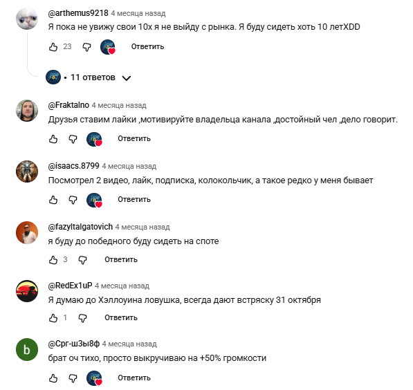 Комментарии на телеграмм-канале отключены: подписчики не могут публично задавать вопросы или делиться негативным опытом. На YouTube комментарии открыты, однако среди них заметны однотипные фразы с призывами ставить лайки и подписываться. Никакой конкретики нет, никто из довольных клиентов не благодарит за прибыль от инвестиций.