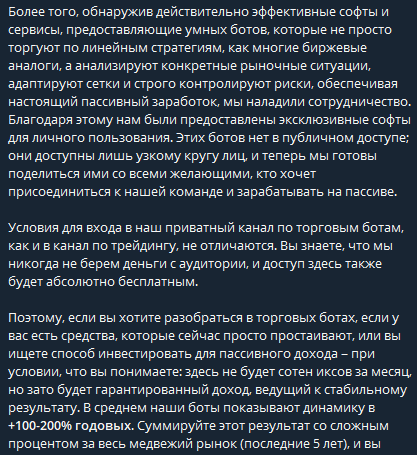 Второй продукт – торговые боты. Для вступления в закрытый канал по ботам нужно написать Moder Mk. Автор обещает зарабатывать на пассиве без активного трейдинга, описывая это как систему с «гарантированным» доходом в 100–200% годовых, но по какому именно методу работает программа, непонятно.