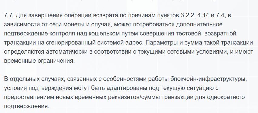 В пункте 7.7 предусмотрена «тестовая транзакция» на адрес, который генерирует сама система Alamery, в качестве обязательного условия для возврата средств.