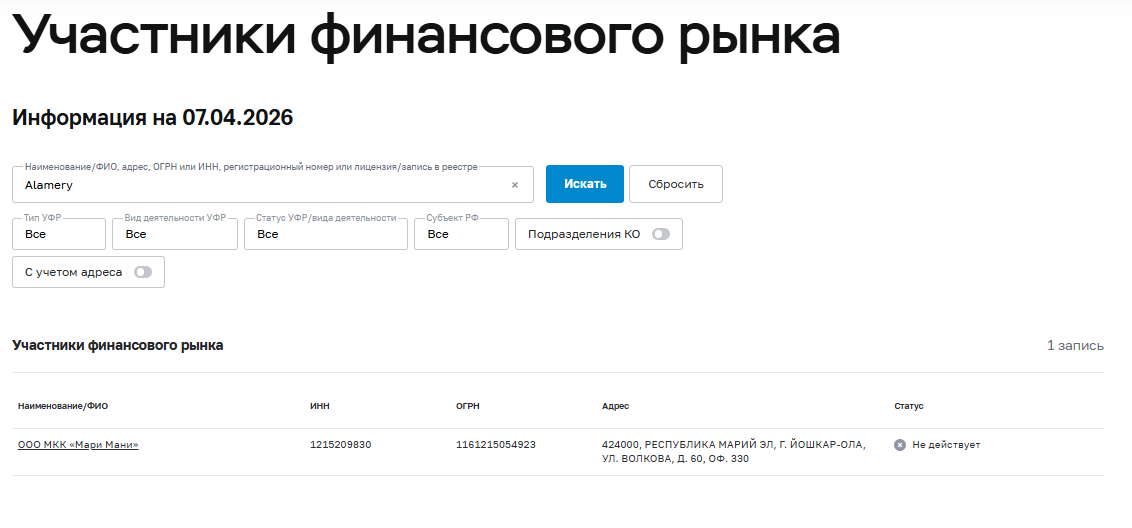 Кто конкретно стоит за проектом, установить нельзя: на сайте нет ни названия организации, ни страны регистрации, ни адреса, ни каких-либо реквизитов. Пользовательское соглашение при этом адресовано резидентам России и апеллирует к российскому праву, хотя сами же создатели базовые требования этого права не выполняют. Лицензии на обменную деятельность у Alamery нет.