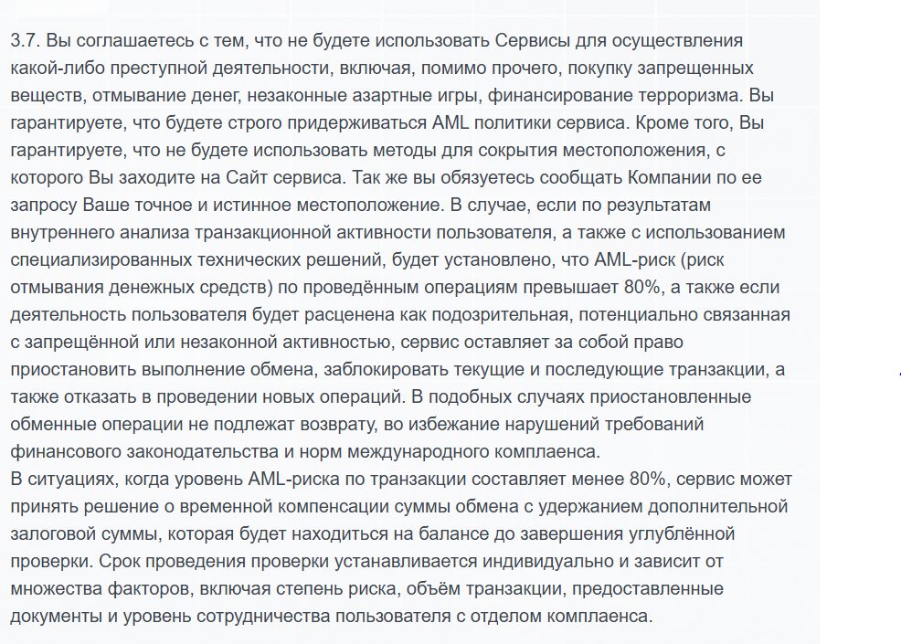 Согласно пункту 3.7 при AML-риске выше 80% администрация вправе заблокировать деньги без возврата, а при меньшем уровне риска с клиента удерживается дополнительный залог.
