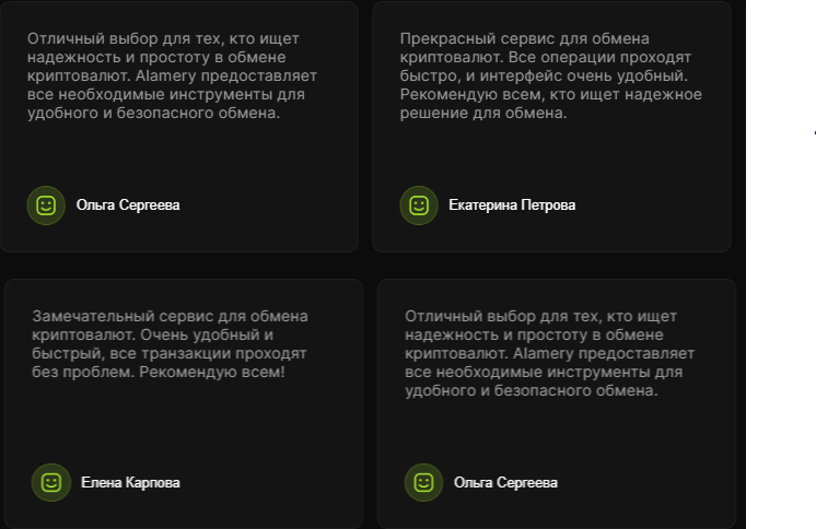 Отзывы клиентов об Alamery com есть только на самом сайте обменника. На главной странице их несколько десятков, однако при внимательном прочтении одни и те же имена встречаются подряд по несколько раз с идентичными текстами. Все комментарии устроены одинаково: общие слова о скорости и надежности без единой конкретной детали.