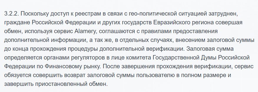 В пункте 3.2.2 соглашения указано, что что граждане России и стран Евразийского региона должны вносить «залоговую сумму» перед прохождением верификации. Размер этой суммы якобы устанавливает «Комитет Государственной Думы Российской Федерации по финансовому рынку». Никакого отношения к регулированию частных криптообменников этот орган не имеет.
