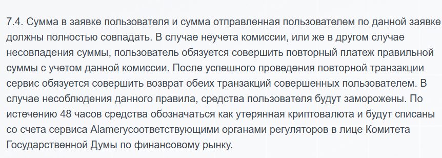 В пункте 7.4 описана ситуация, когда клиент отправил сумму, не совпадающую с заявкой: средства блокируются на 48 часов, и если повторный платеж за это время не поступает, деньги «списываются органами регуляторов в лице Комитета Государственной Думы».