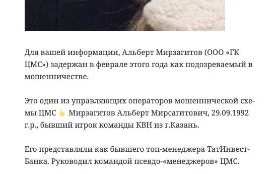 Мирзагитова упоминают только в одном материале в интернете. В нем как раз сказано о том, что данный человек проходит в качестве одного из подозреваемых по делу о мошенничестве со стороны компании ООО «ГК ЦМС».