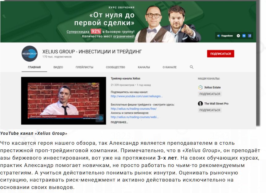 Якобы опытный трейдер Александр Александров работает в команде образовательного проекта Xelius Group. Отзывы об этом обучающем курсе в сети неоднозначные. Авторы тренингов обещают научить каждого выгодно, профессионально покупать и продавать активы на американских фондовых рынках.