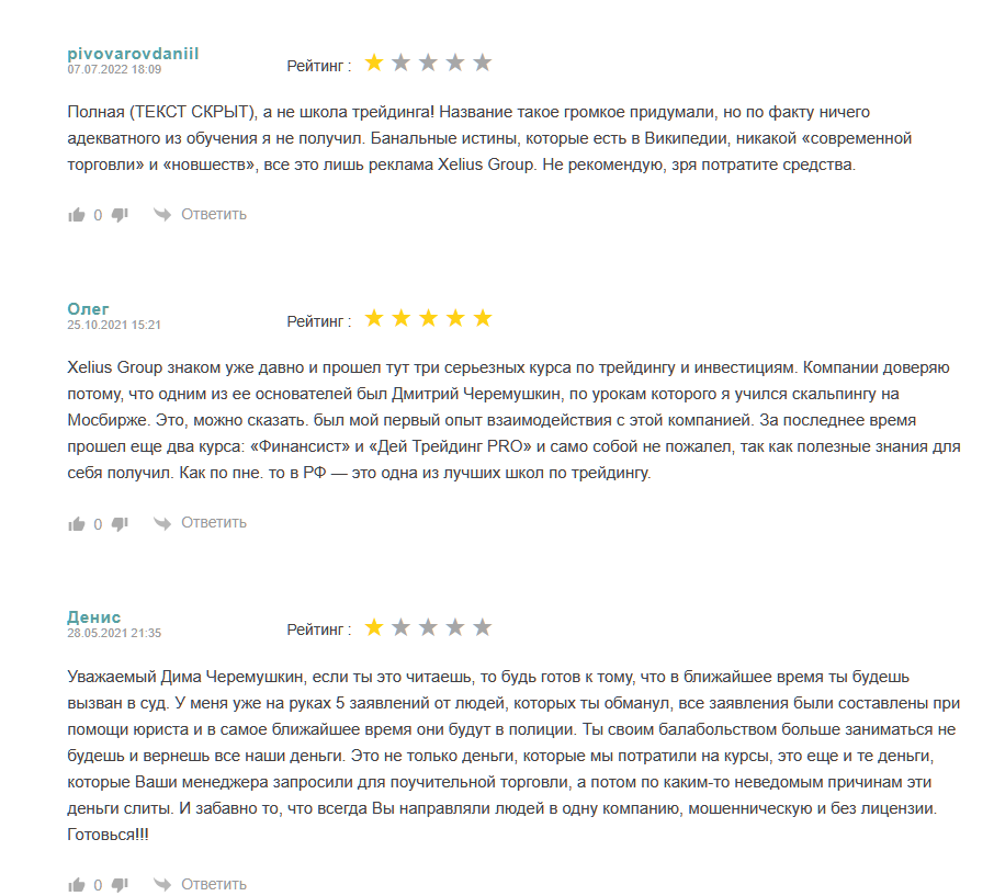 Про обучающую платформу Xelius Group, где работал Александров, отзывы в основном негативные. Трейдеры жалуются, что зря потратили деньги на абсолютно бесполезные курсы. Для многих, кто следовал стратегиям наставников школы, торговля принесла убыток и быстрый слив депозита. Результат обучения отрицательный.
