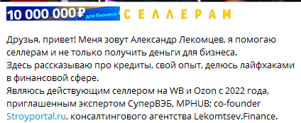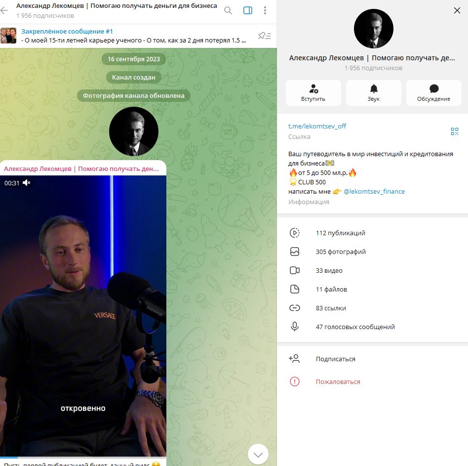 Автор ведет свою деятельность через Телеграмм-канал Александр Лекомцев | Помогаю получать деньги для бизнеса (lekomtsev off). На проект подписано почти 2 тысячи пользователей, активность есть, поэтому накрутка в данном случае маловероятна.