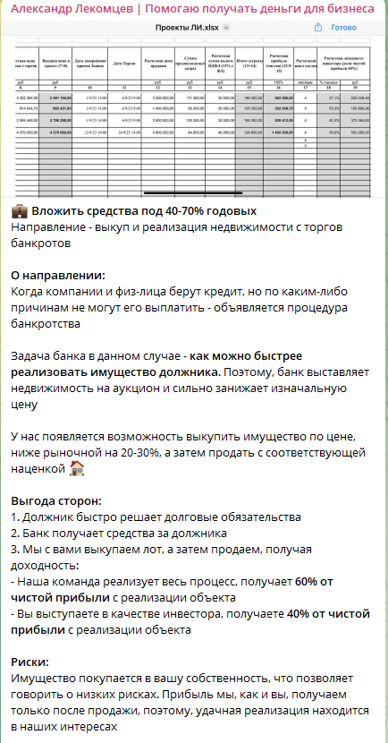 Также Александр предлагает инвестиции с доходностью 40-70% годовых. Объекты – это недвижимость, купленная с торгов.