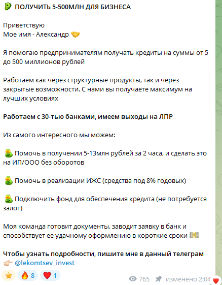 Автор Aleksandr Lekomcev предлагает пользователям разные направления для сотрудничества. Одно из основных – помощь в получении заемных средств для бизнеса. Подробно условия в открытом доступе не указываются.