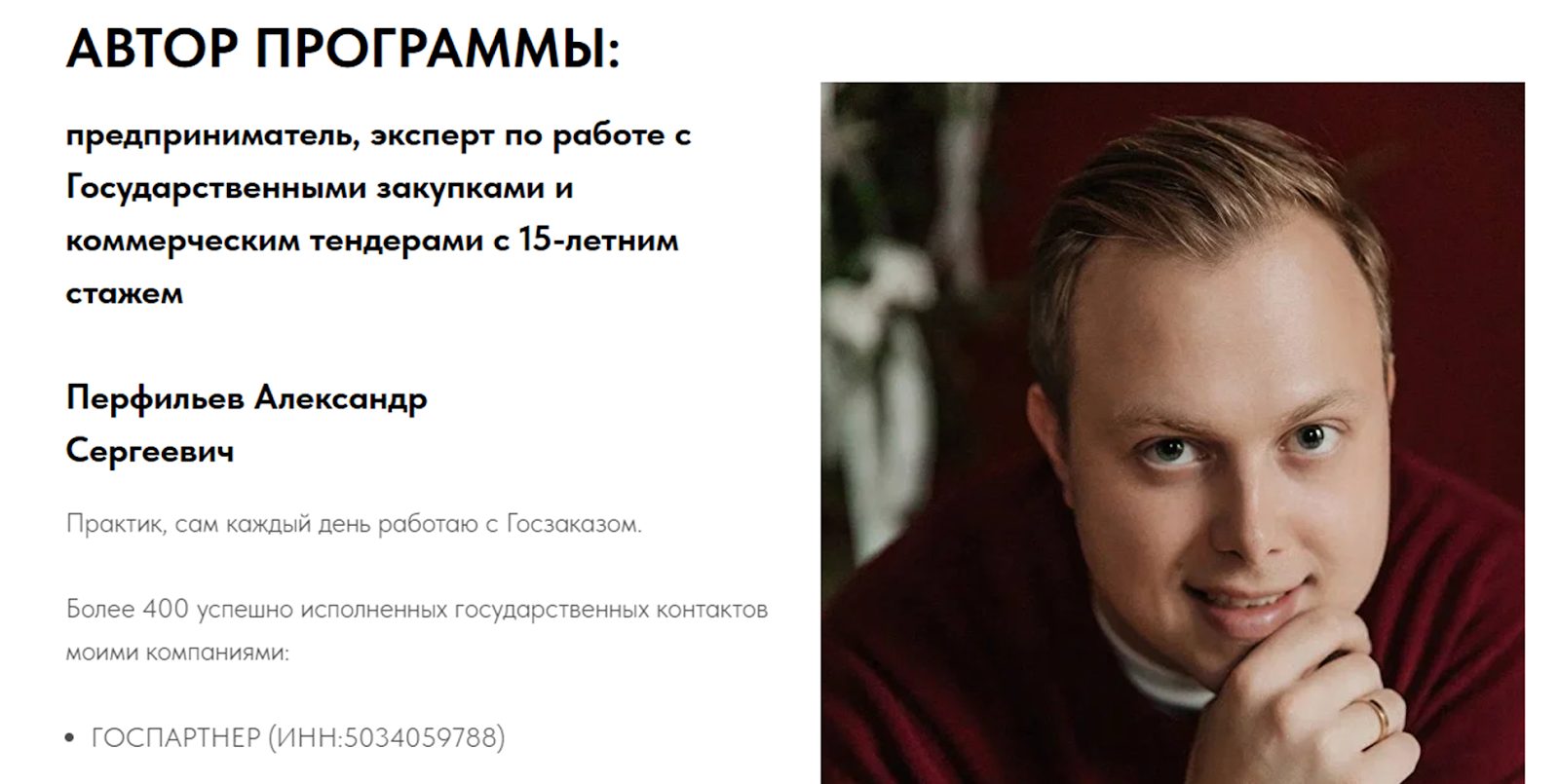 Александр Перфильев – специалист по госзакупкам, основатель собственной онлайн-школы, где обучает, как зарабатывать на тендерах от государства. Мужчина имеет довольно большую аудиторию в соцсетях, где делится опытом. Стоит ли подписываться на нашего героя и покупать его курсы, расскажем в обзоре.