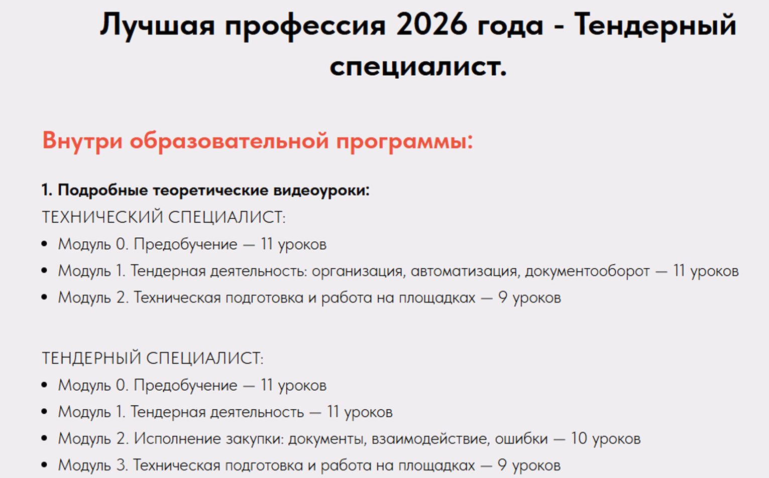 - «Тендерный специалист» – цена курса 80 000 рублей, включает месяц обучения и месяц стажировки, доступ в чат, диплом и официальное трудоустройство.