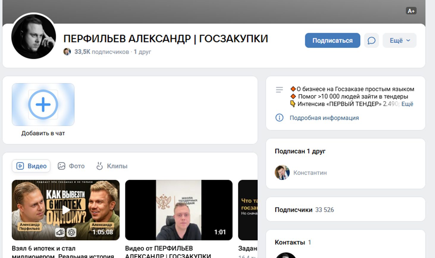 Больше всего пользователей в паблике ВК « Перфильев Александр Госзакупки». На него подписано свыше 33 000 пользователей. Полезного контента здесь немного, в ленте в основном короткие мотивационные ролики. Их цель – прогрев подписчиков к покупке основного курса. Комментариев под постами очень мало, как и лайков.